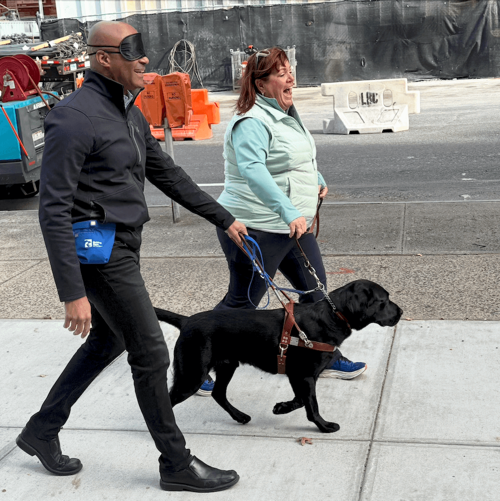 There have already been many memorable moments for me thus far. I vividly remember visiting our Patterson Canine Development Center, where our dogs are born and spend their first eight weeks being gently introduced to the world of humans with early training and socialization. A staff member placed a newborn Labrador named Felice in my arms, and in that moment, I felt profoundly connected to the very beginning of a guide dog’s journey. Just four weeks later, I witnessed Felice confidently defeat a myriad of challenges and artificial distractions as she underwent her Pup Test, an early assessment we use to determine the suitability of a dog to proceed with guide dog training. I also participated in a blindfold walk with one of our guide dogs and some of our trainers through downtown White Plains, near our Urban Training Center. As I navigated busy city streets, supported by our staff and guided by the assertive dog, I gained a deeper appreciation for the real-world challenges our clients face every day.