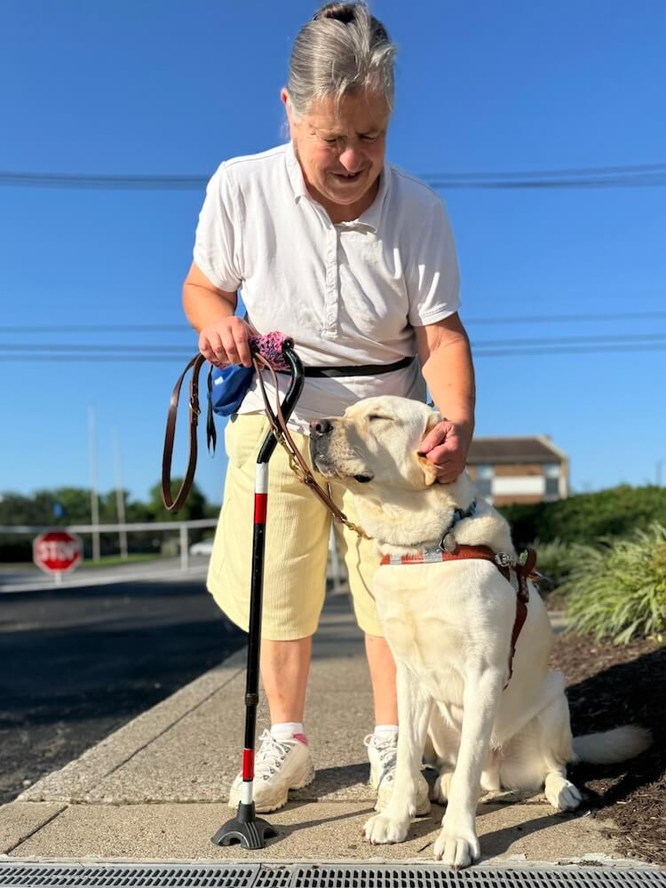 How would you describe your guide dog? “Gandalf is an 81 lb yellow, gentle giant. He is a loveable dog with a smooth, soft coat and a beautiful, large head, and he loves to be brushed. In harness, he is careful, cautious, very obedient, and adjusts very well to any changes in my walking speed. Gandalf had specialized training to deal with my balance issues. He matches my pace, slows down when I do, and speeds up when I do that too. Even in the house when he’s not working, if I stand up and feel a little unstable, when I put my hand out, he will be standing right beside me. He is very sensitive to my needs and balance issues. He is always right by my side. Susan did such a wonderful job training him for me. He is such a good guide and such a good boy. He is a real gem, and Guiding Eyes can be very proud of him. Melinda, our remote instructor, came out last week and was very impressed with him.”