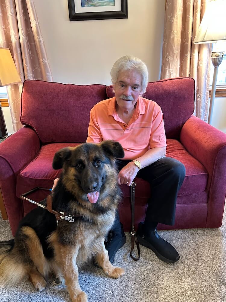 Marc is originally from Lowell, Massachusetts, but he and his wife of 55 years, Claire, snowbird between their hometown of Wells on the coast of Maine and southwest Florida. They have two adult daughters and two grandchildren. Marc lost his vision in December 1960. Beginning in seventh grade, he attended the Perkins School for the Blind and later earned an undergraduate degree in management from Boston College, graduating in 1971. Marc worked for Raytheon Technologies, a defense contractor, for 37 years, until 2009. His role involved acquiring semiconductor resources for their missile development programs. His retirement interests include listening to football and baseball broadcasts, reading, playing cards, and taking outdoor walks. Idril is Marc’s fifth German Shepherd guide dog and his third from Guiding Eyes, however she is his first female guide.