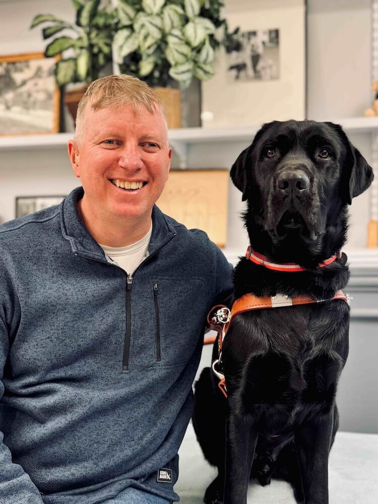 Mark was born in New Jersey and raised in Pennsylvania. After graduating from high school, he attended Messiah College, earning his degree in elementary education. He went on to teach 2nd, 3rd, and 4th graders for nineteen years. At forty-seven, Mark began losing his sight and now has only light sensitivity. Diagnosed with retinitis pigmentosa caused by Usher’s Syndrome, a genetic disorder, he retired the same year due to progressive vision loss. Mark and his wife, Stacy, have been married for nearly a decade and have a young son, Bodi, who is in elementary school. Although Mark says he has slowed down somewhat, he still enjoys watching sports – especially the Philadelphia Eagles, listening to audiobooks, and relaxing by the shore with his family. An avid runner, Mark has completed half marathons in 37 states and plans to run in his thirty-eighth later this year. His long-term goal is to run a race in all 50 states. Denzel is Mark’s second guide dog from Guiding Eyes. His first guide dog, Arlo, joined him in 2017, retired in October 2025, and now lives with Mark and his family.