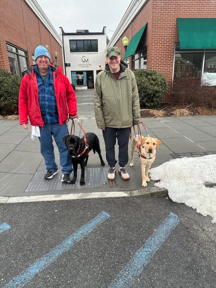 How would you describe your guide dog? “Awesome. Denzel has lots of energy yet remains a gentle giant. He guides me at a relaxed walking pace; I never feel like I am being dragged along. He gets along great with my wife and son, as well as Arlo. Friends and family describe him as, cute as a button.”