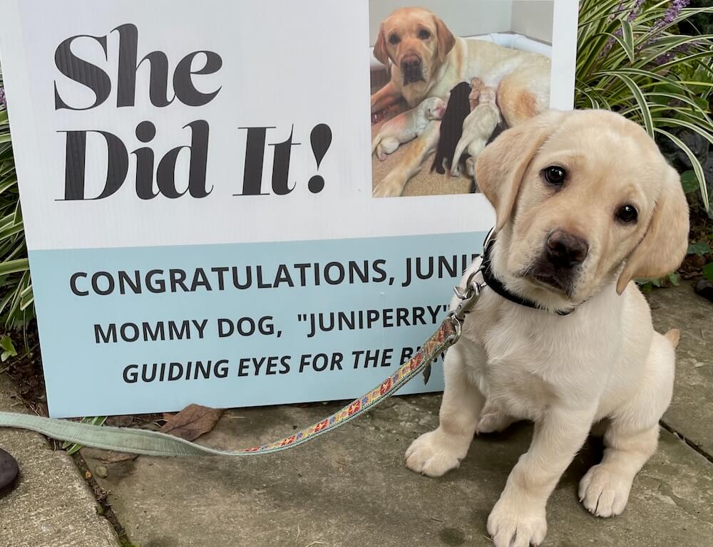 Quinnah was a delight to raise! We also raised her mother, Juniper, and Quinnah clearly inherited her mother’s love for people. Quinnah enjoyed all sorts of outings, but her favorite was undoubtedly going to yoga twice a week and socializing with her human classmates — several of whom still ask when she’s coming back! Quinnah was also popular with the canine crowd, and loved her playtime with the local GEB dogs including our pet dog Polly (released); in fact, we asked Polly for her canine assessment of Quinnah, and she responded: “Outstanding for a yellow lab! Runs fast! Shares toys!”. We’re excited Quinnah will be a guide, and send all our best wishes to the new team! ~ Catherine Seibert and Fred Wright