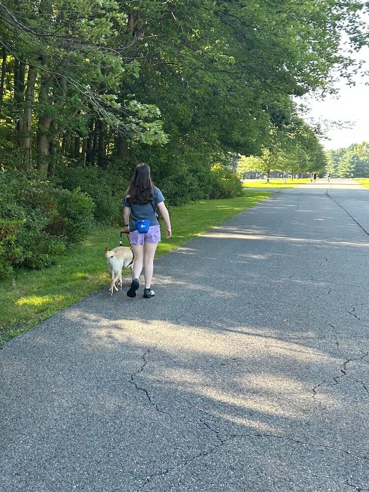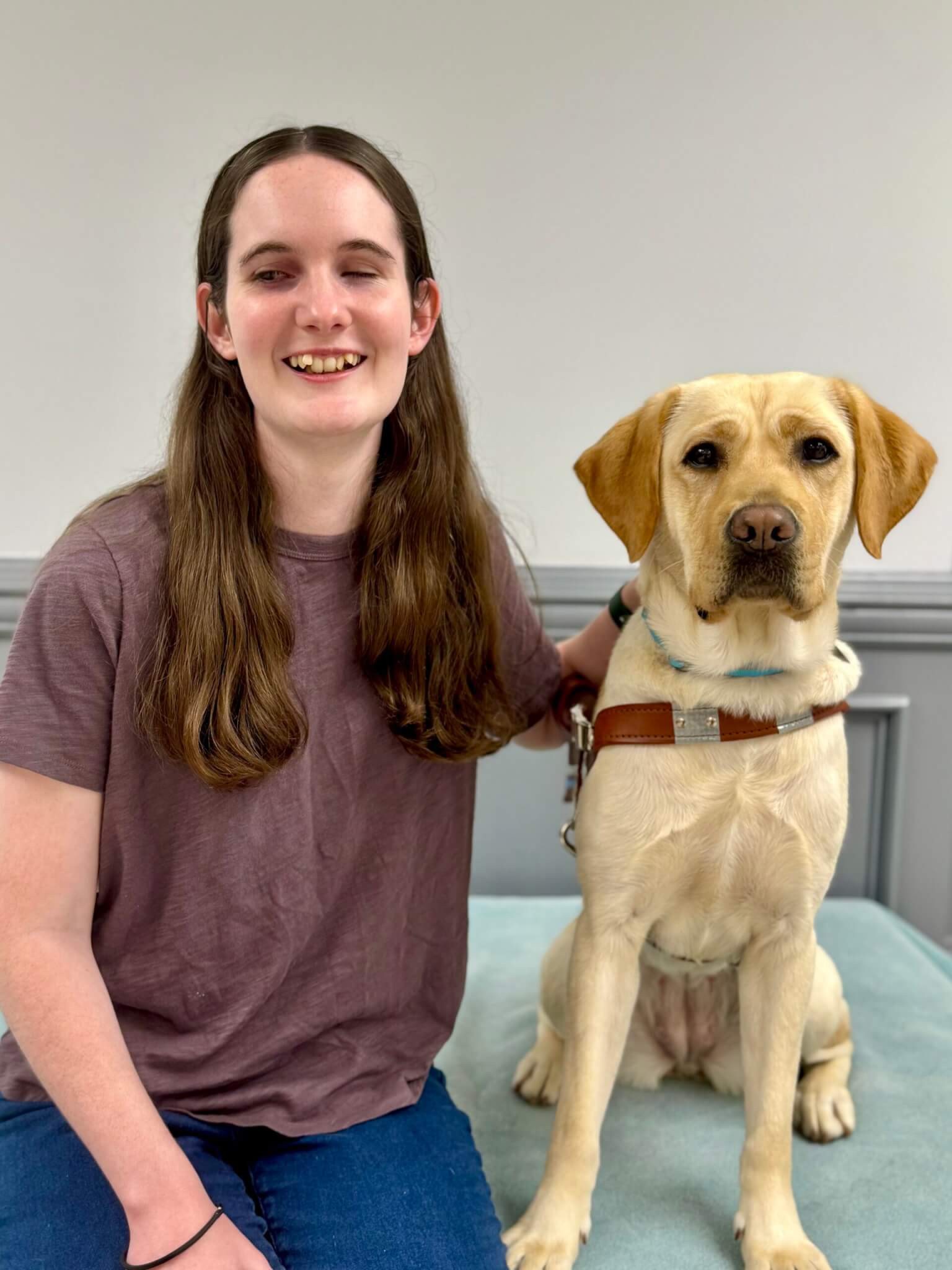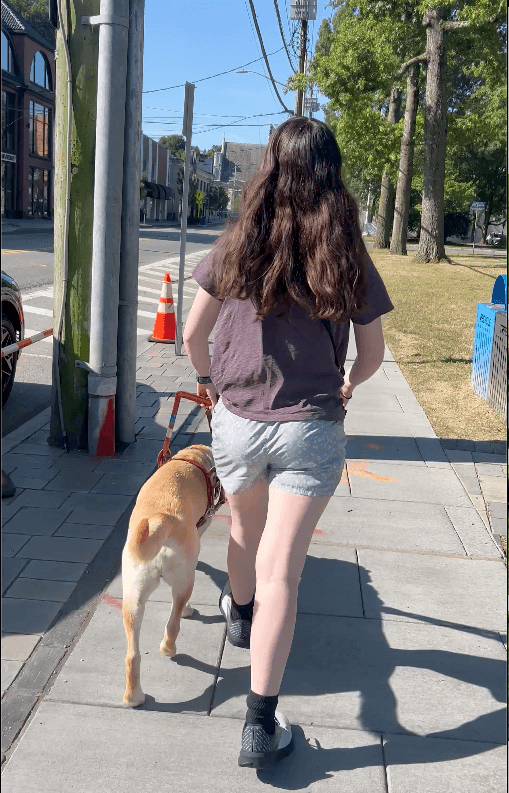 How would you describe your guide dog? “Out of harness, Melon is friendly, excitable, and cuddly. She loves people and will walk up to greet them. In harness, she’s focused, weaving around cars and crowds on campus. She walks fast, so my friends call her Zoomie Girl. Melon is so smart and picked up our routes really well. We get surprised all the time with construction, trees being cut down, and people everywhere. One time when a tree was being cut, I started in the tree’s direction, and Melon wouldn’t let me go near it.”