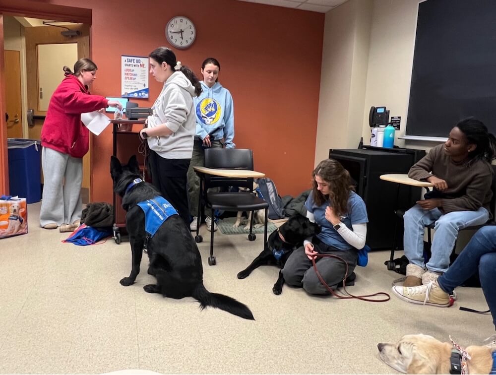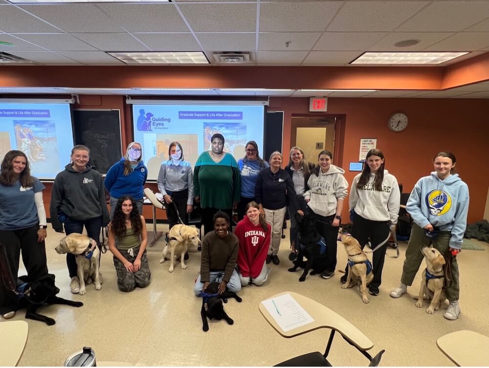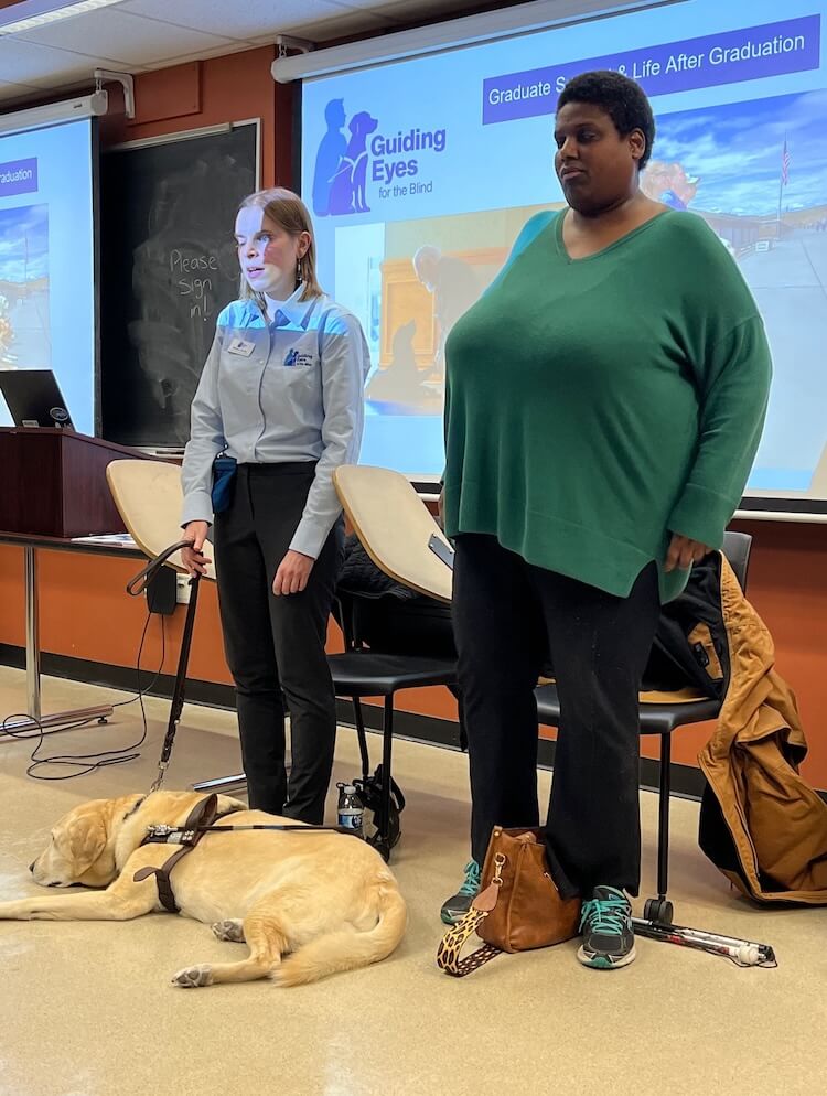 Members of the Guiding Eyes Client Experience team recently traveled to the University of Delaware (UDel) campus in support of the Puppy Raising Program and to share information with UDel’s Access:Ability Scholars program. It was a meaningful and successful event, demonstrating the amazing full circle of the Guiding Eyes mission. Nikki Wentz (Admissions Manager), Meka White (Client Navigator), Melissa Carney (Community Outreach & Graduate Support, with guide dog Aron), and Laura Peterman (Chief of Staff) joined Cindy and members of the Guiding Eyes puppy raising club and their pups-on-program. Through presentations by Guiding Eyes staff, students gained a clearer understanding of how a friendly puppy raised by a classmate eventually becomes a guide dog, providing independence, companionship, and mobility to individuals who are blind or have low vision.